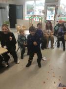 We painted using apple halves, which encouraged hand strength and coordination while introducing the colours, and textures of the season. Our falling leaves song was a big hit! The children used tissue paper and felt the breeze from a hairdryer, helping them connect sound, movement, and touch in a playful way.