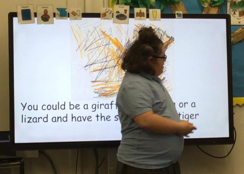 We started the process by placing illustrations from the story in the correct order and describing what was happening using symbols, communication pages or by telling the adult. We then changed the animals in the first half of the story and decided what they could be doing. For the second half of the story, pupils chose actions or things that they were good at. There have been some very imaginative actions including smelling stinky feet, playing Roblox, break dancing and eating sausages and mash!