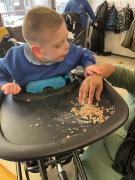 In our lessons this week, our favourite was definitely our communication session, Fun With Food, where we used all of our senses to explore some granola! The children loved using their ears to listen to how the granola clattered on the tables, using their touch to explore all the different foods in the granola, and especially loved using their mouths to taste it!