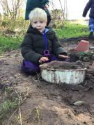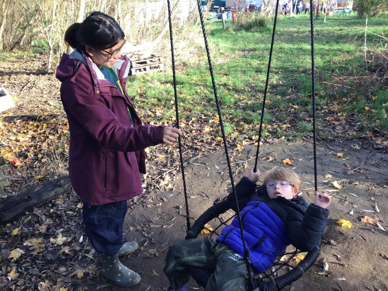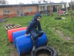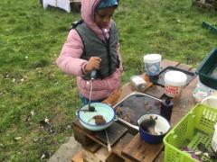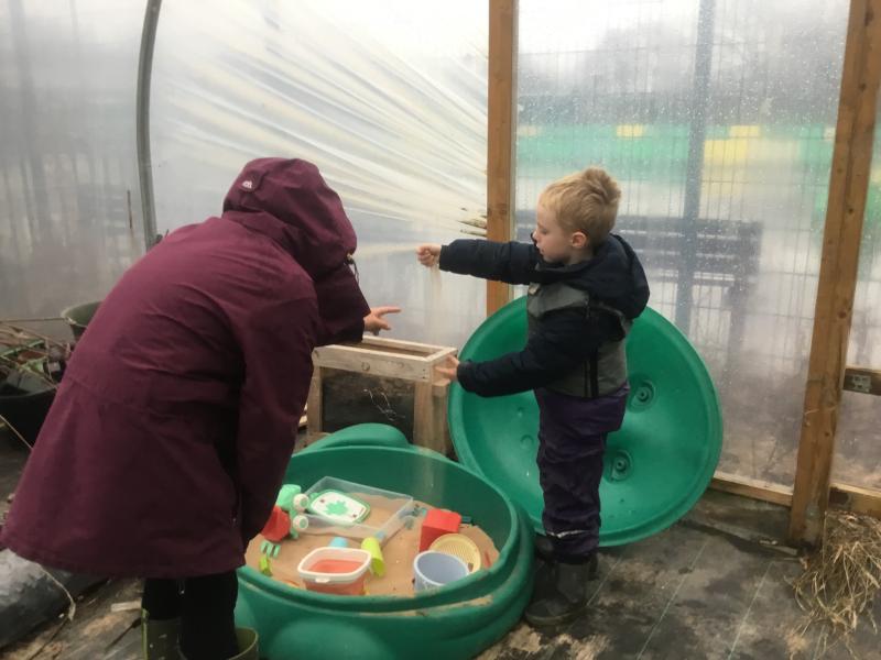 Over the weeks, the children have enjoyed a wide range of outdoor experiences: making music with different household items, rolling balls down ramps, and climbing through trees, and across barrels. They’ve loved watching the chickens, relaxing on the swings and hammocks and, of course, jumping in plenty of muddy puddles! In the polytunnel there have been activities such as threading and making Christmas decorations using pine cones.