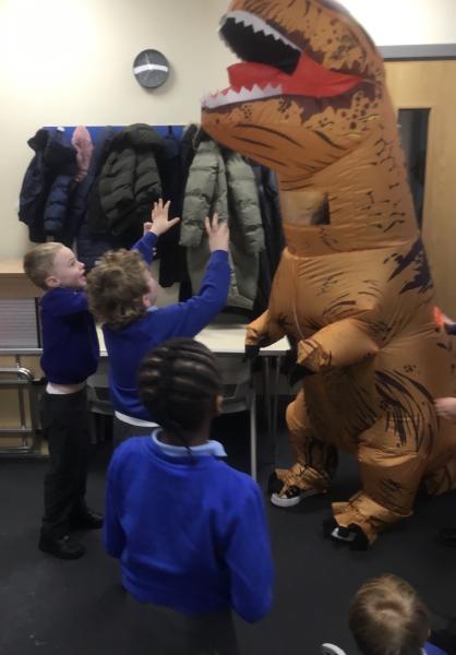 We then travelled all the way back to the age of the dinosaurs. The children enjoyed playing with dinosaur figures, making salt dough fossils and digging in the ‘soil’ to discover dinosaur bones. This was made even more special today when a real-life dinosaur came to visit us in class. What a memorable end to a brilliant week.