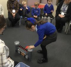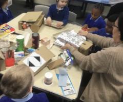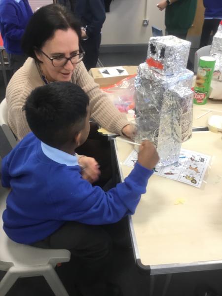 We then travelled back to the medieval period, building and playing with a wooden castle, dressing up as knights, and pretending to slay a dragon. The next day our time machine took us to the future, where we discovered a robot in our inspiration box. The children enjoyed watching it dance and sing, before using junk modelling materials to create their own robots.